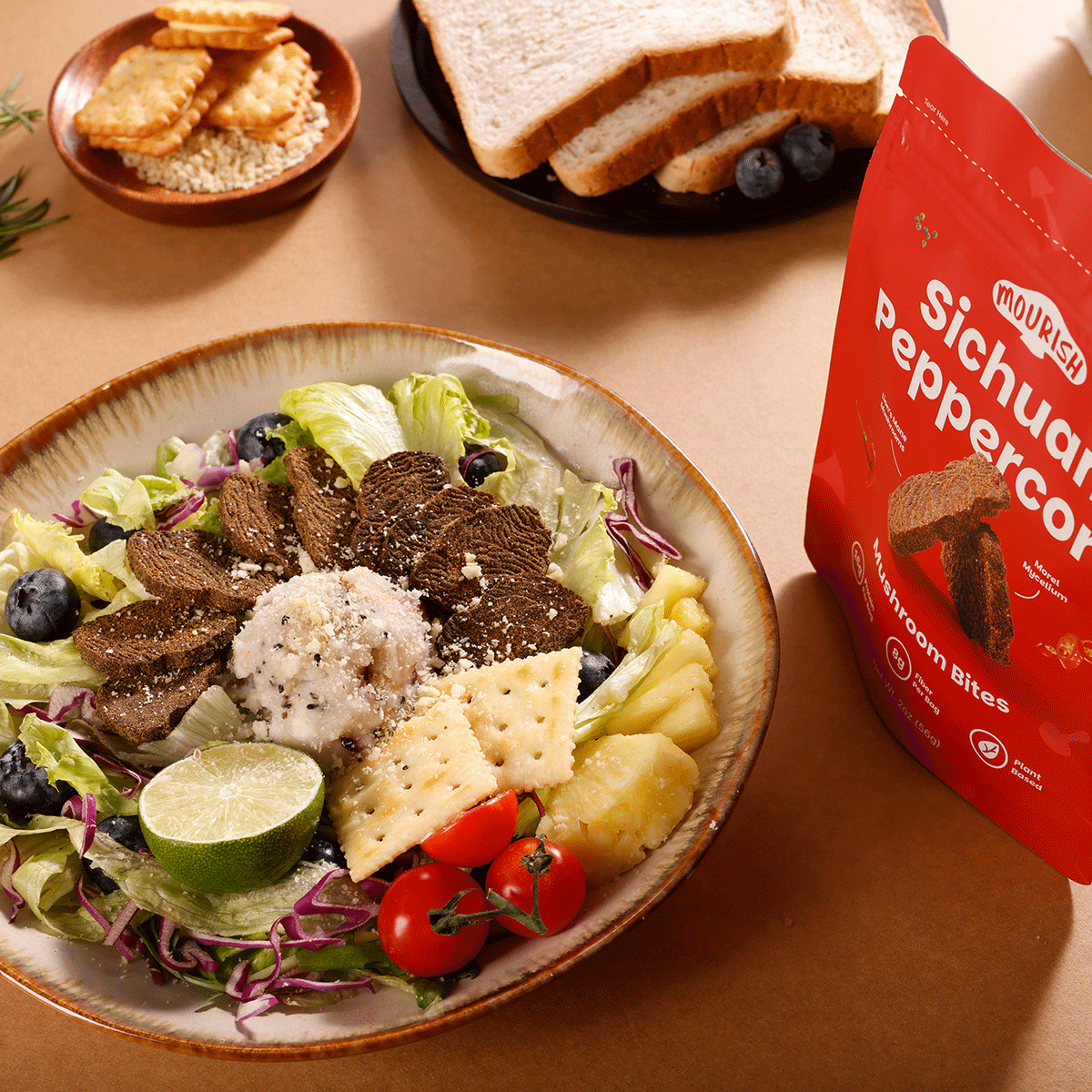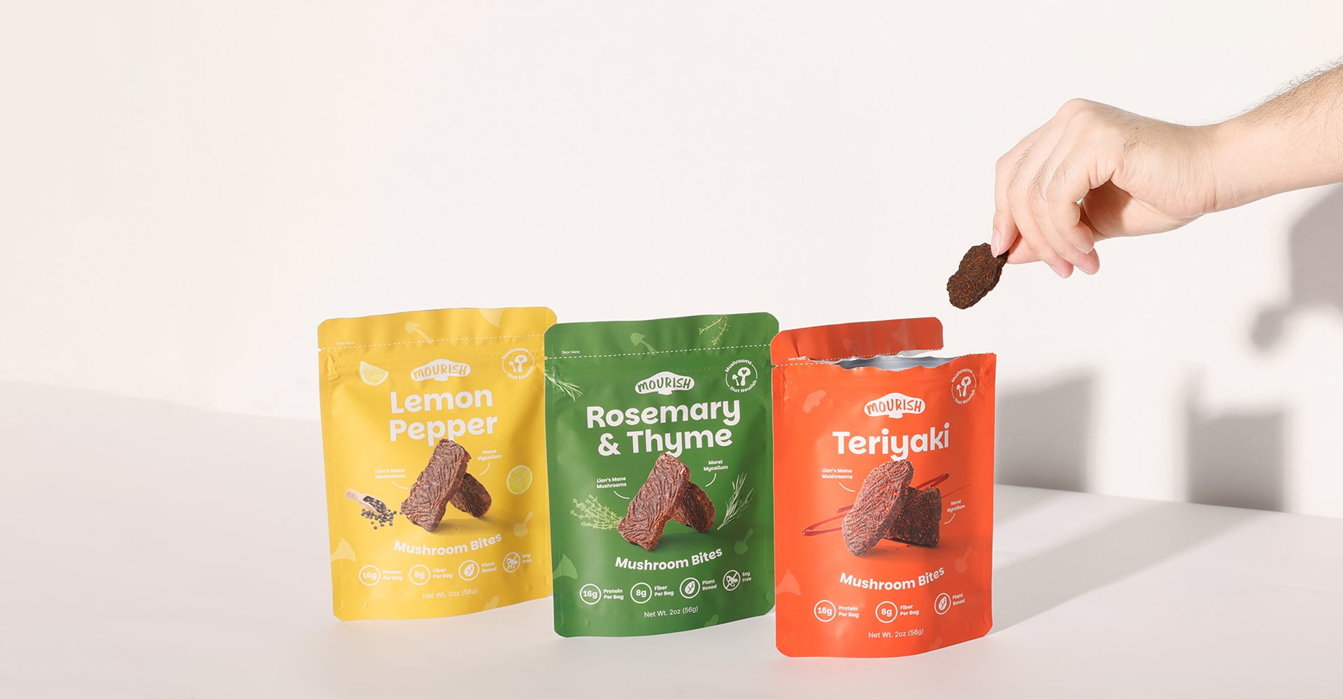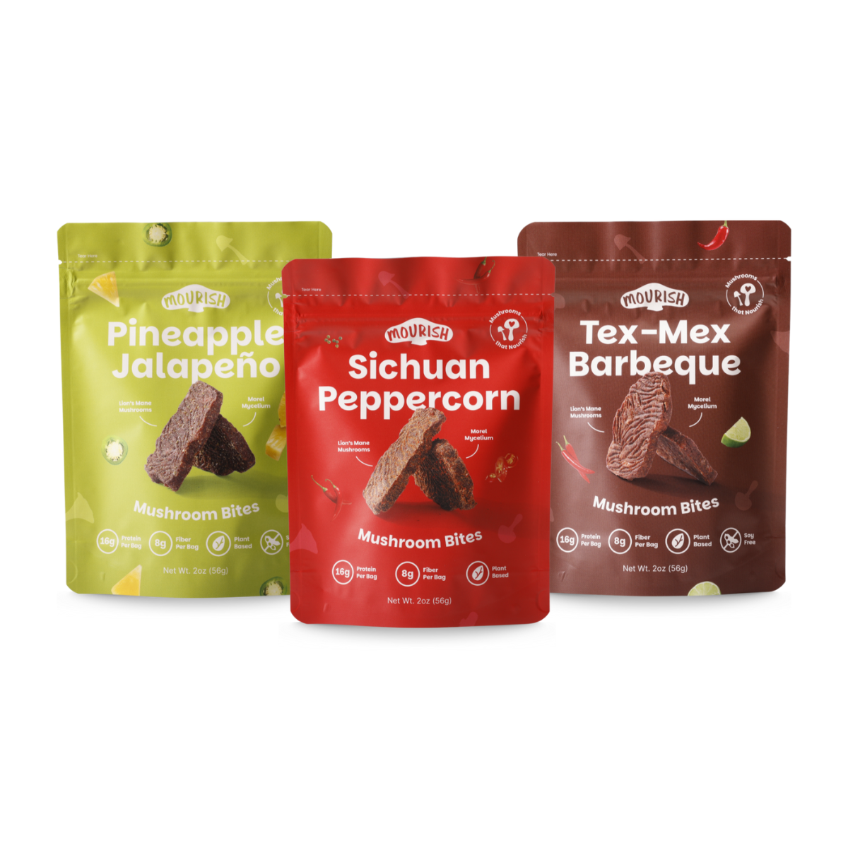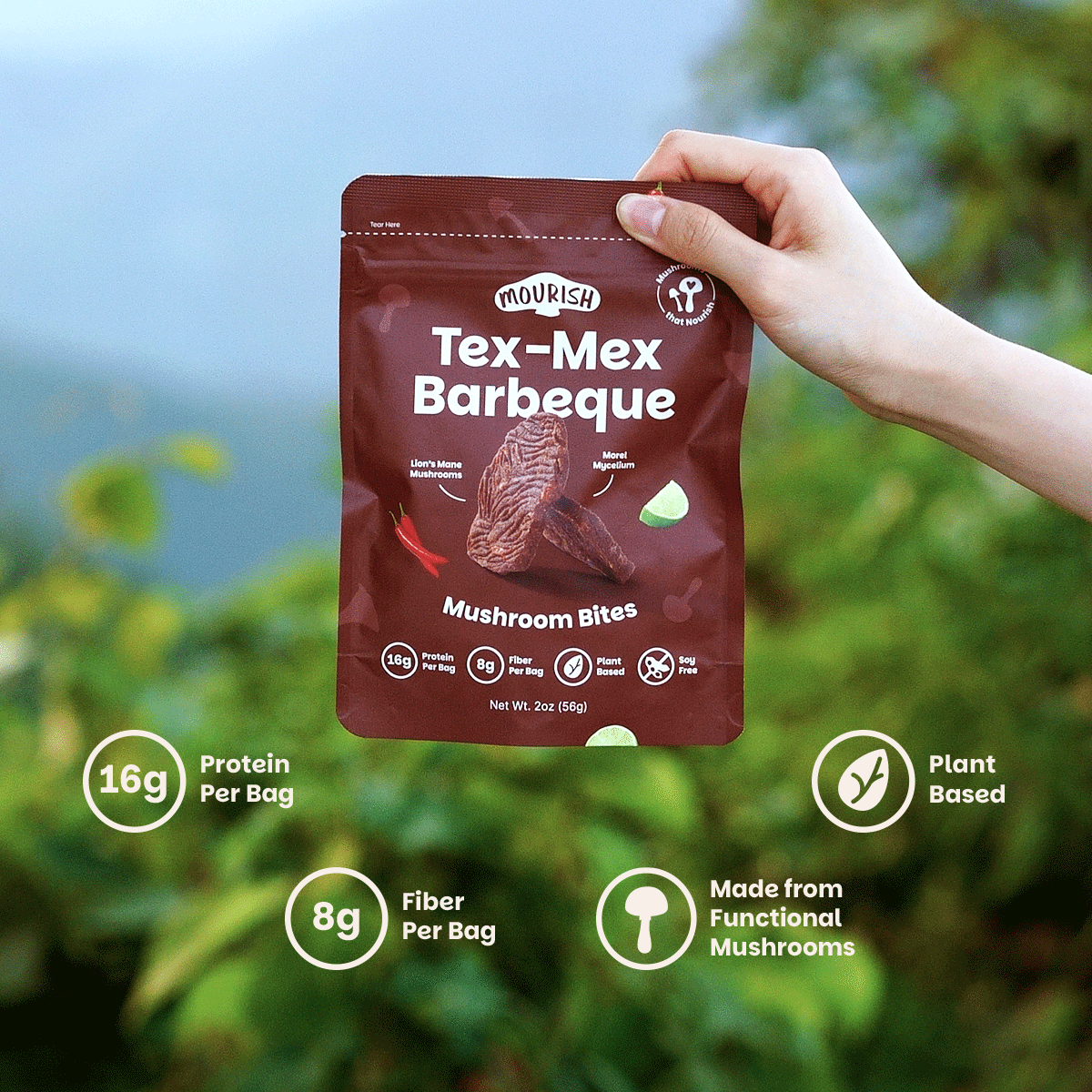 Mourish Bites bring all the depth and chew of our original jerky — now in bite-sized form and more functional than before. Made from Lion's Mane and Morel mycelium, each piece is umami-rich, satisfyingly chewy, and seasoned with real ingredients.