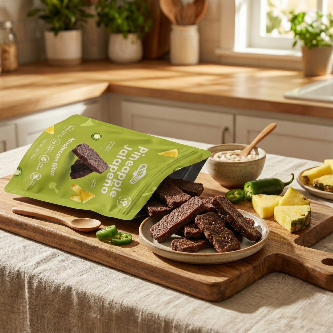 Mourish Bites bring all the depth and chew of our original jerky — now in bite-sized form and more functional than before. Made from Lion's Mane and Morel mycelium, each piece is umami-rich, satisfyingly chewy, and seasoned with real ingredients.